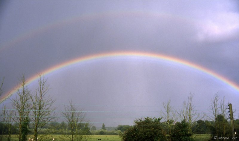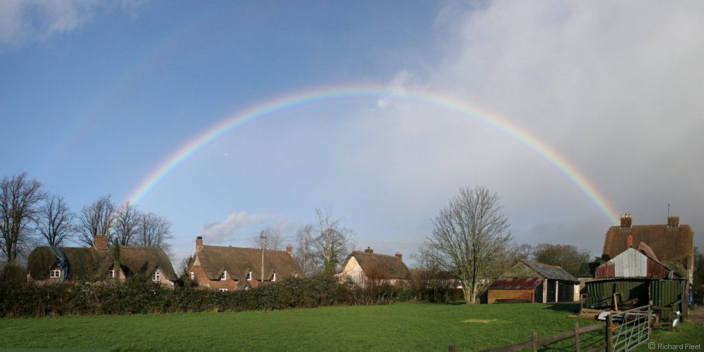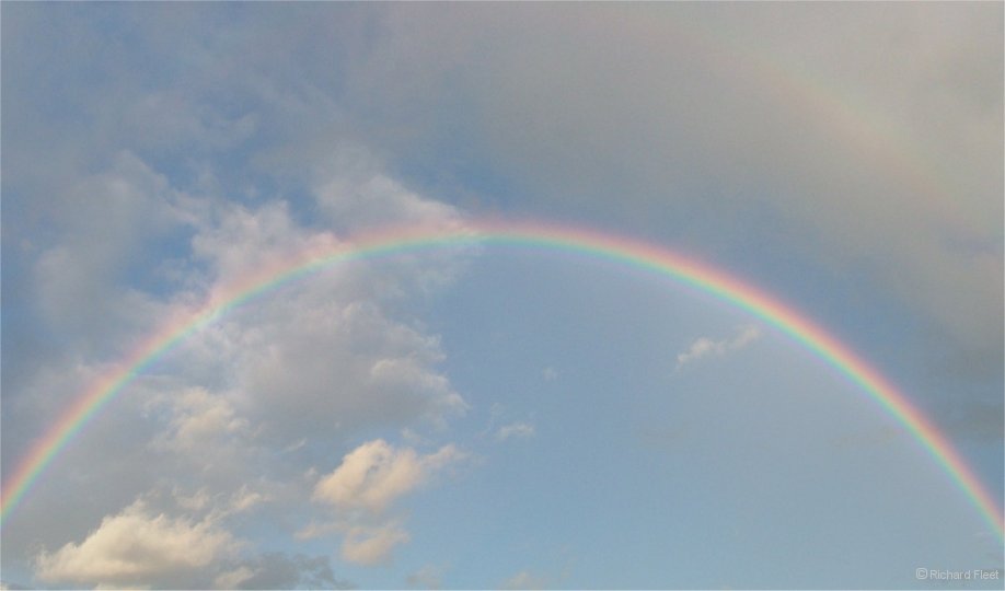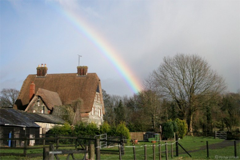 A fast moving shower left behind enough falling drops to catch the sunshine and give a nice clear rainbow. The sun altitude was 16 degrees.