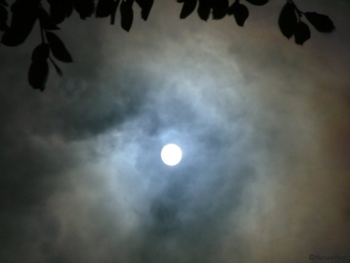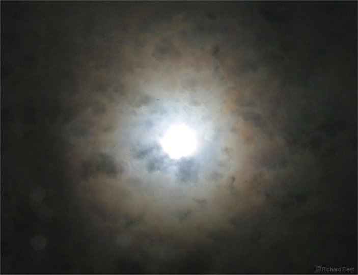 The aureole round the sun, formed by thin cloud, seen reflected in the surface of a pond. This reduced the brightness to a safe level.