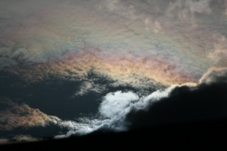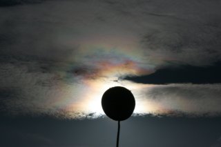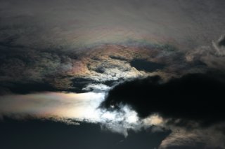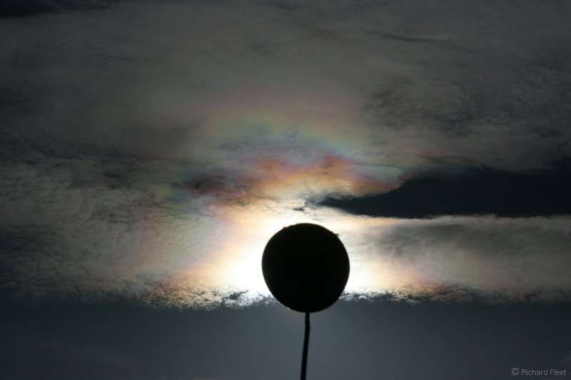 The corona is rather irregular because of the varying drop sizes, but shows strong almost metallic colours.