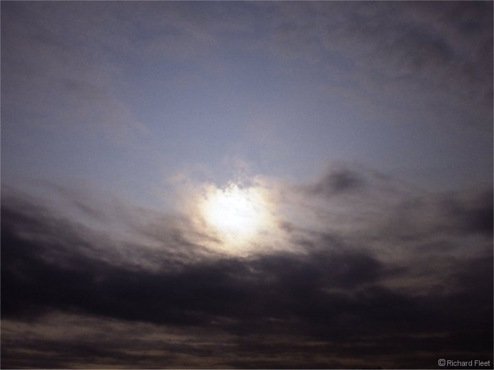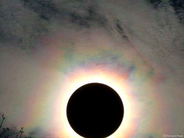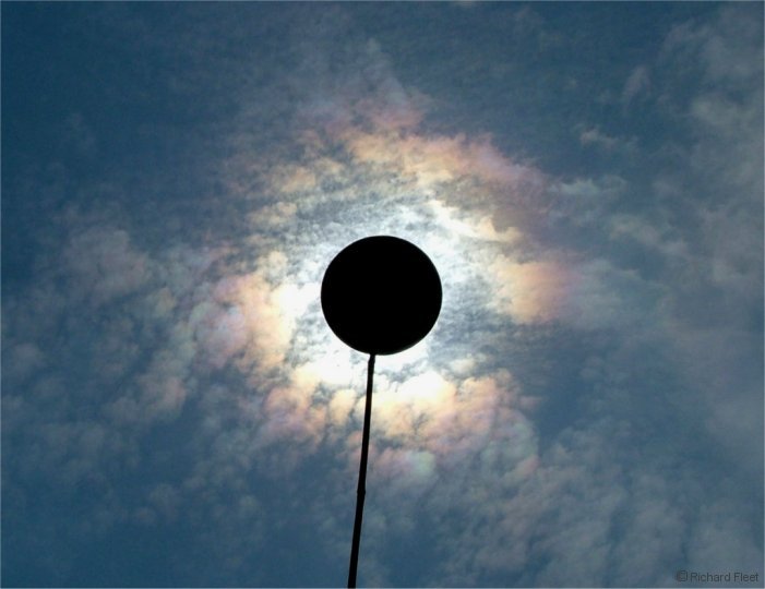 In this image the corona is rather mottled because of varying drop sizes in the individual patches of cloud. The patchy colouring shows how blurred the boundary is between corona and iridescence.