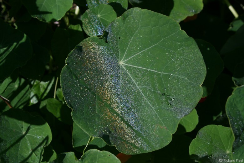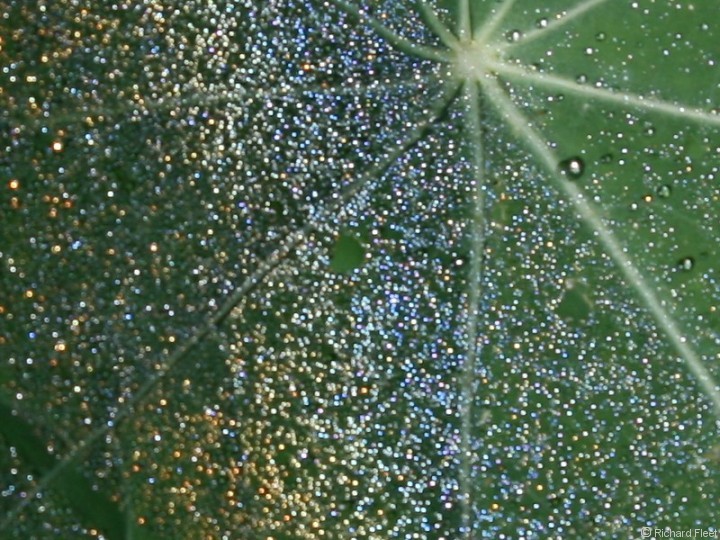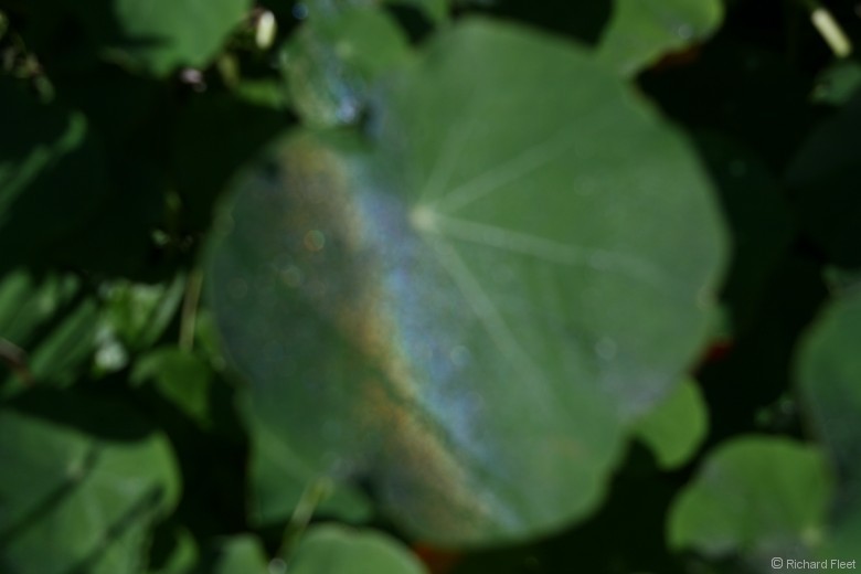 A fine layer of morning dew on nasturtium leaves provided this distinct dewbow.