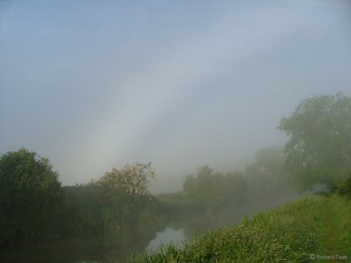 A hundred metres before this point on the canal towpath there wasn't enough fog to form a bow. Two hundred metres further along the path the fog was too thick and no bow was visible.