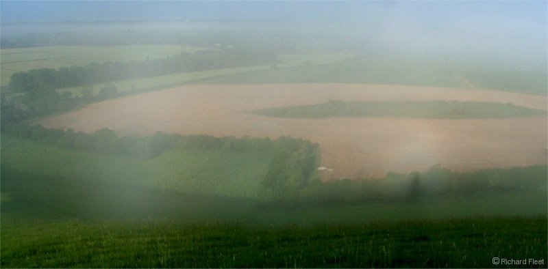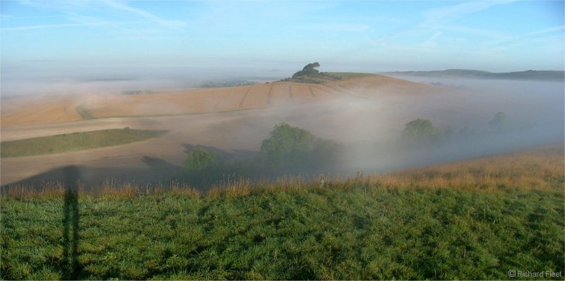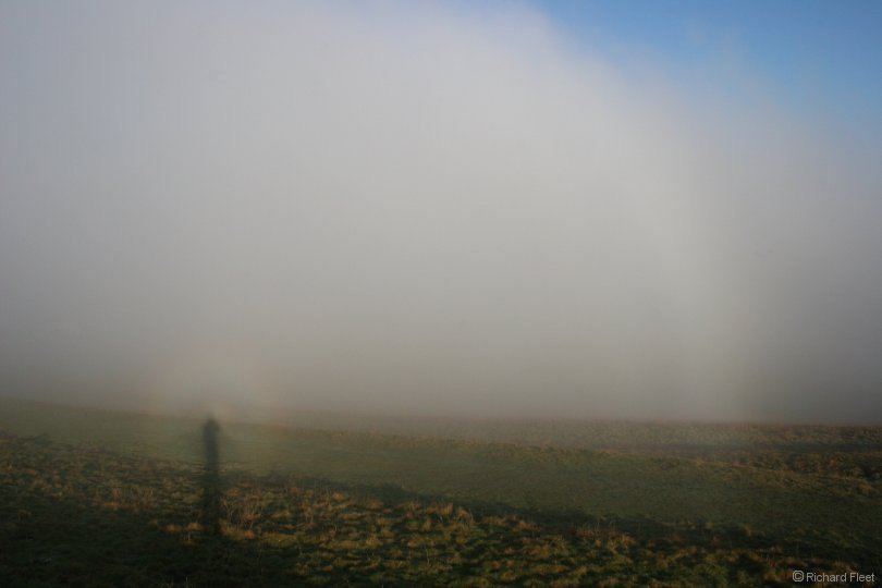 Standing near the edge of the fog my shadow is surrounded by a large glory, with a distinct fogbow to the right. |