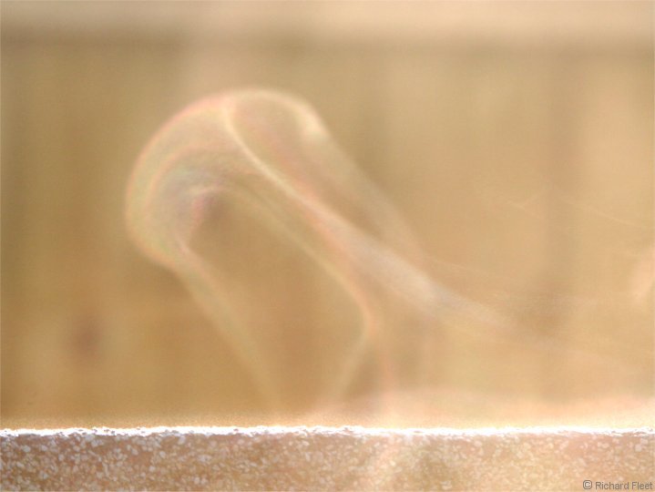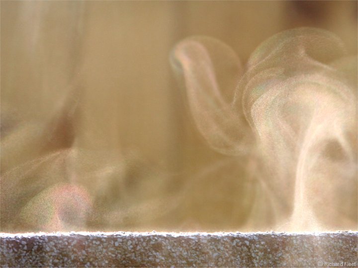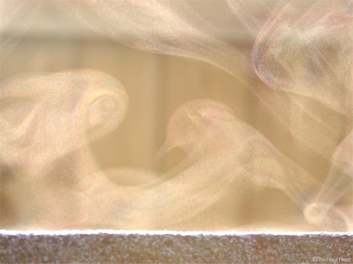 In very calm conditions coloured bands can sometimes be seen following the shapes of the wisps. The slightest breath of wind can spoil the effect.