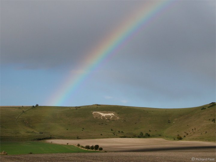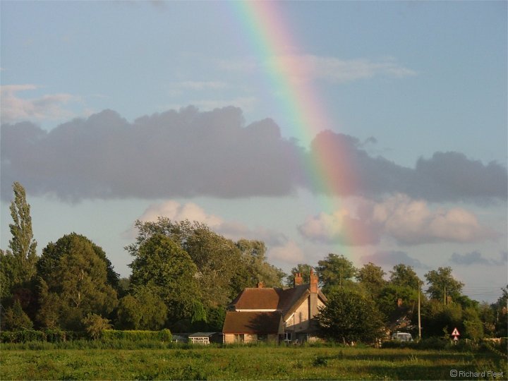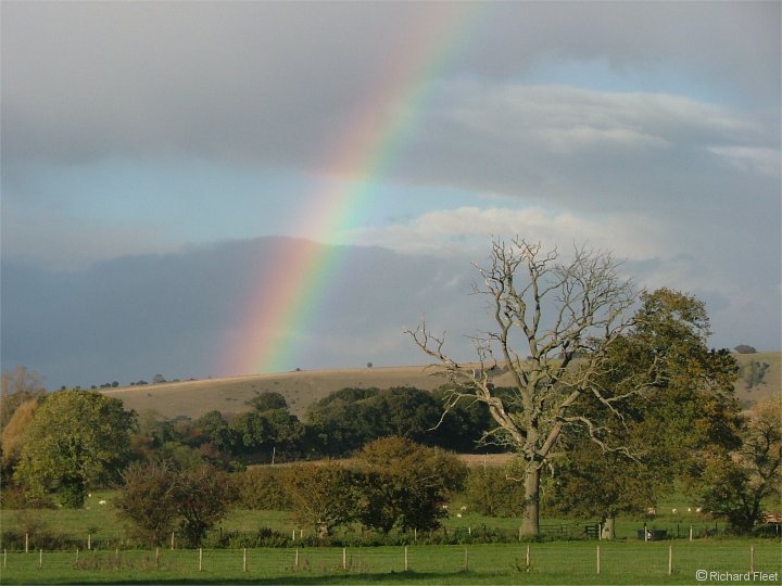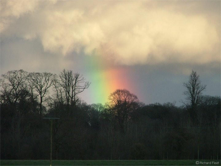 A beautiful bow formed as a heavy winter shower moved away. There is a trace of reflected bow in the large puddle in the field. ( Power cables edited out ) |