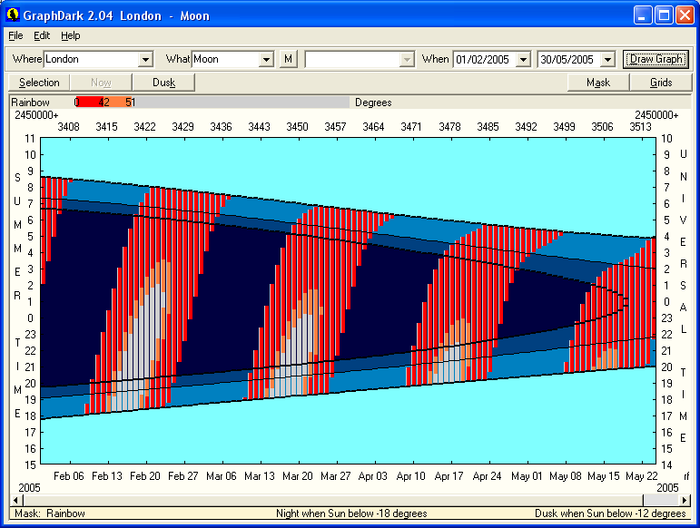 Rainbow visibility for London over much of the year. The light blue area in the centre is when the sun is too high for a natural rainbow. This situation lasts for several hours a day during the summer months. For more details on producing this diagram click here |