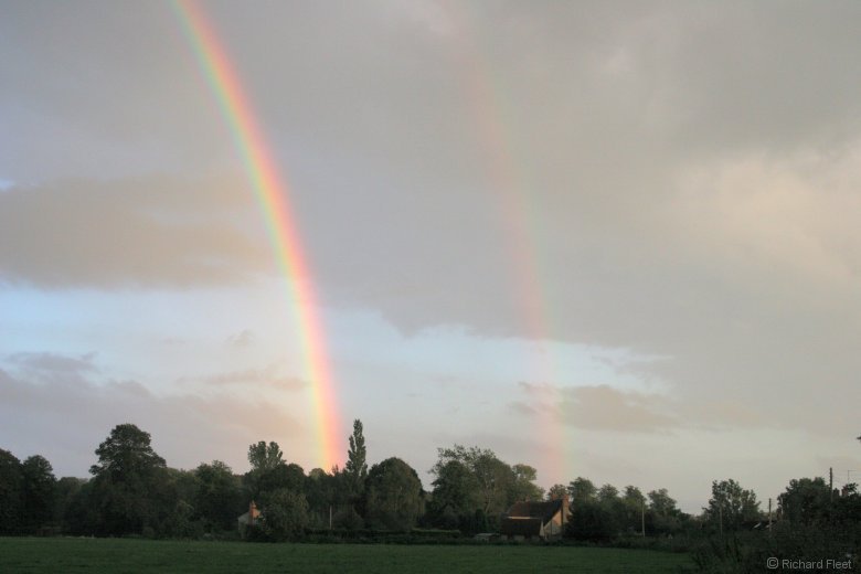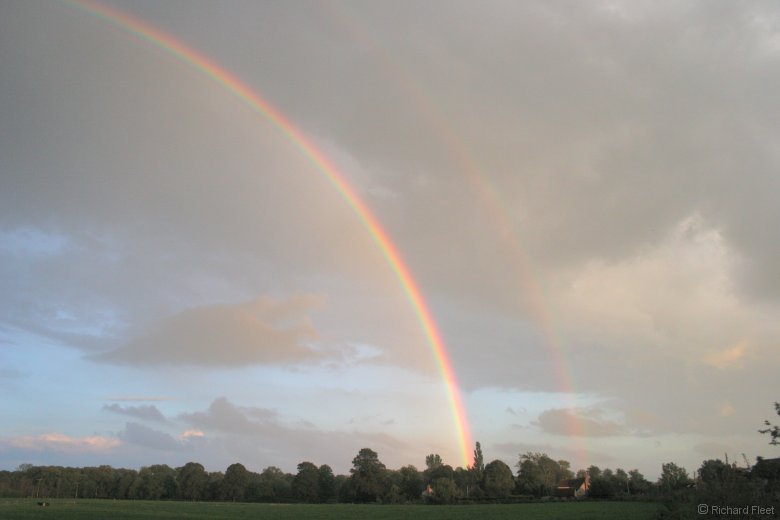The sun was about 1.5 degrees above the horizon for this brief but reasonably bright bow, much of the secondary is also faintly visible.