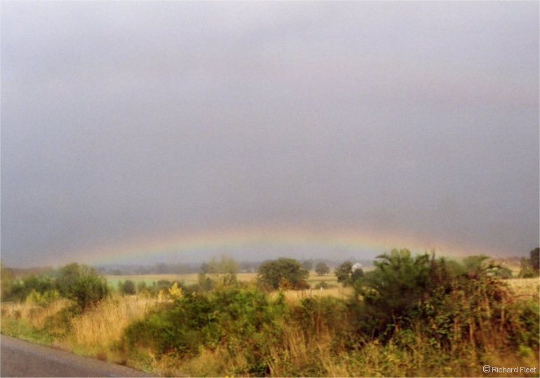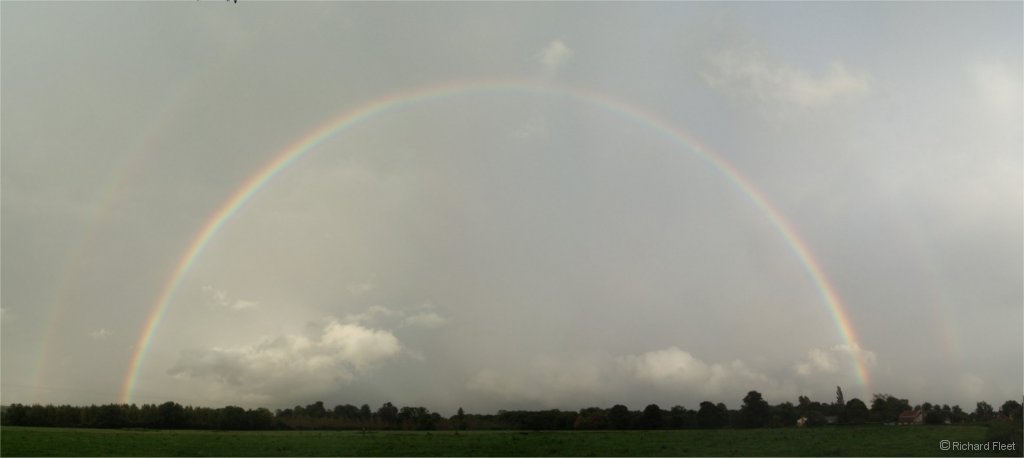 In this mid-afternoon shower in France the sun was around 40 degrees up, so the bow formed just above the horizon.