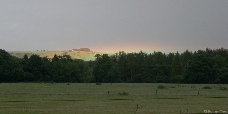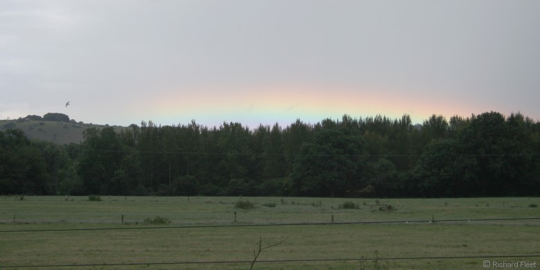 The sun was just over 38 degrees above the horizon so the top of the rainbow barely clears the trees.