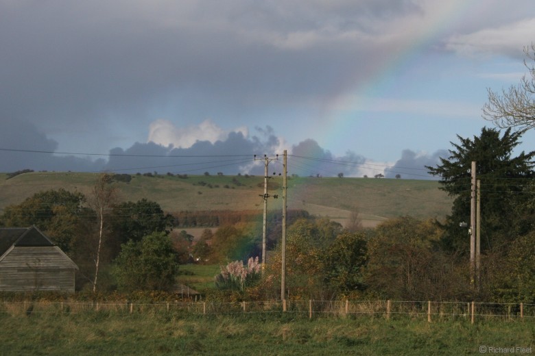 Fast moving showers left rain falling in the clear sky behind them. Against a blue sky the rainbow isn't nearly as obvious. |