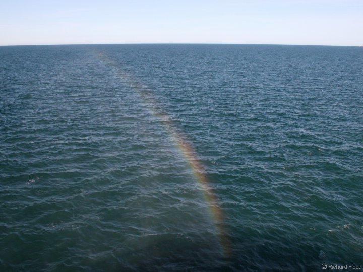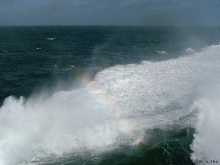 Even on a fairly calm day the spray thrown up by the bow of the fast ferry can sometimes give brief glimpses of spraybow. |