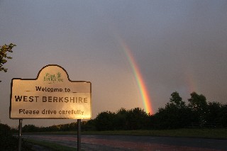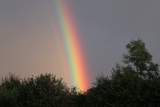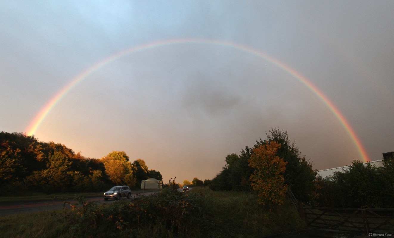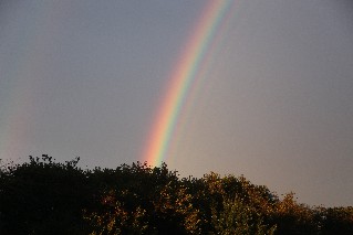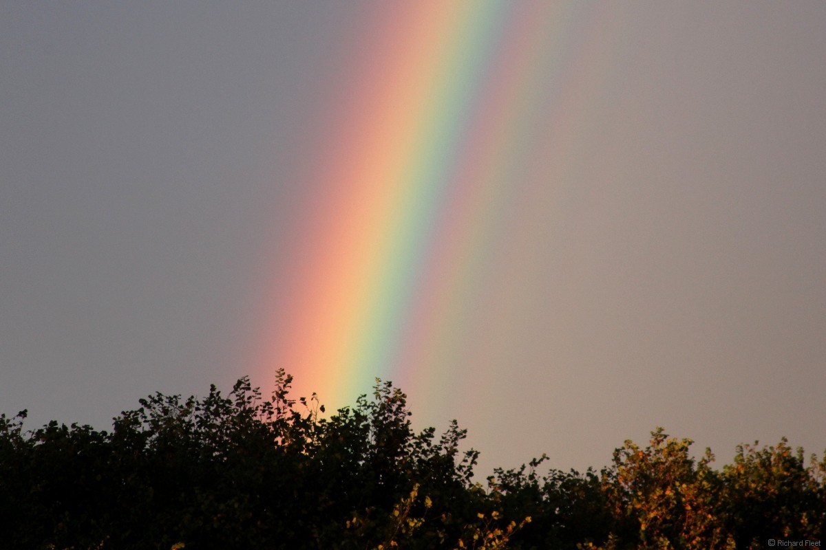 Skies clearing at sunset and a strong rainbow made up for yet another rainy day.