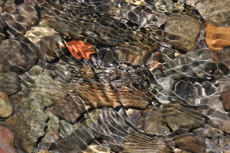A crystal clear, smooth flowing stream in strong sunlight shows a strong caustic network caused by the lensing action of the ripples.