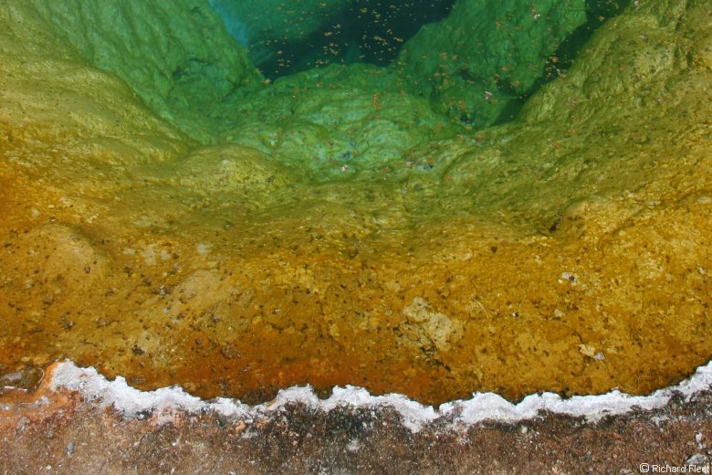 A perfectly calm pool showing the range of bacterial colours with the bluer ones in the deeper hotter water.