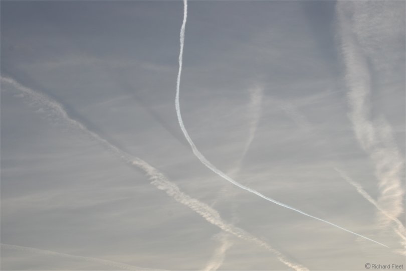 Zooming in shows a curious section of shadow leading off from the fresh curved contrail in the centre, as if only one section of contrail is casting a shadow.
