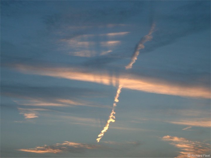The low early morning Sun (4 degrees altitude) is off to the lower right and the contrails appear to cast shadows on the thin cirrus.
