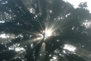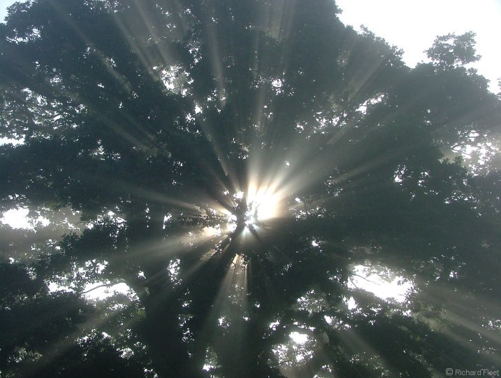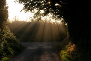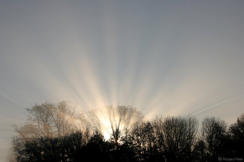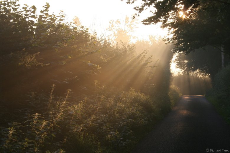 Crepuscular rays can be formed by shadows on thin fog or mist, here the dark hedge provides a good contrast for the sunlit fog.