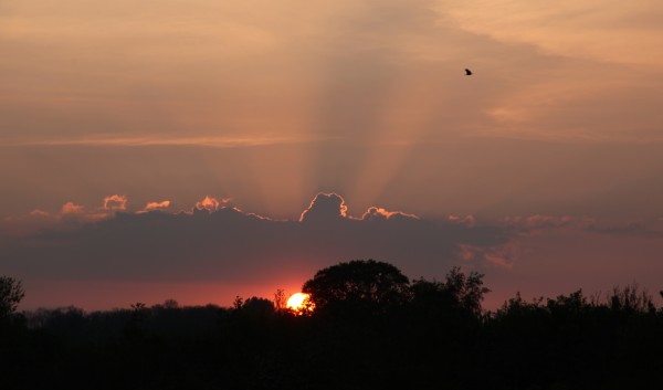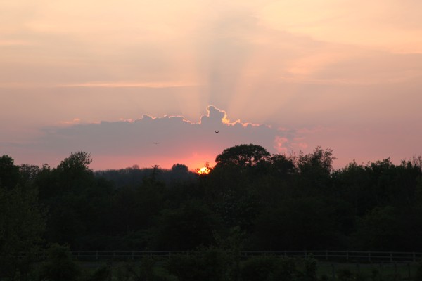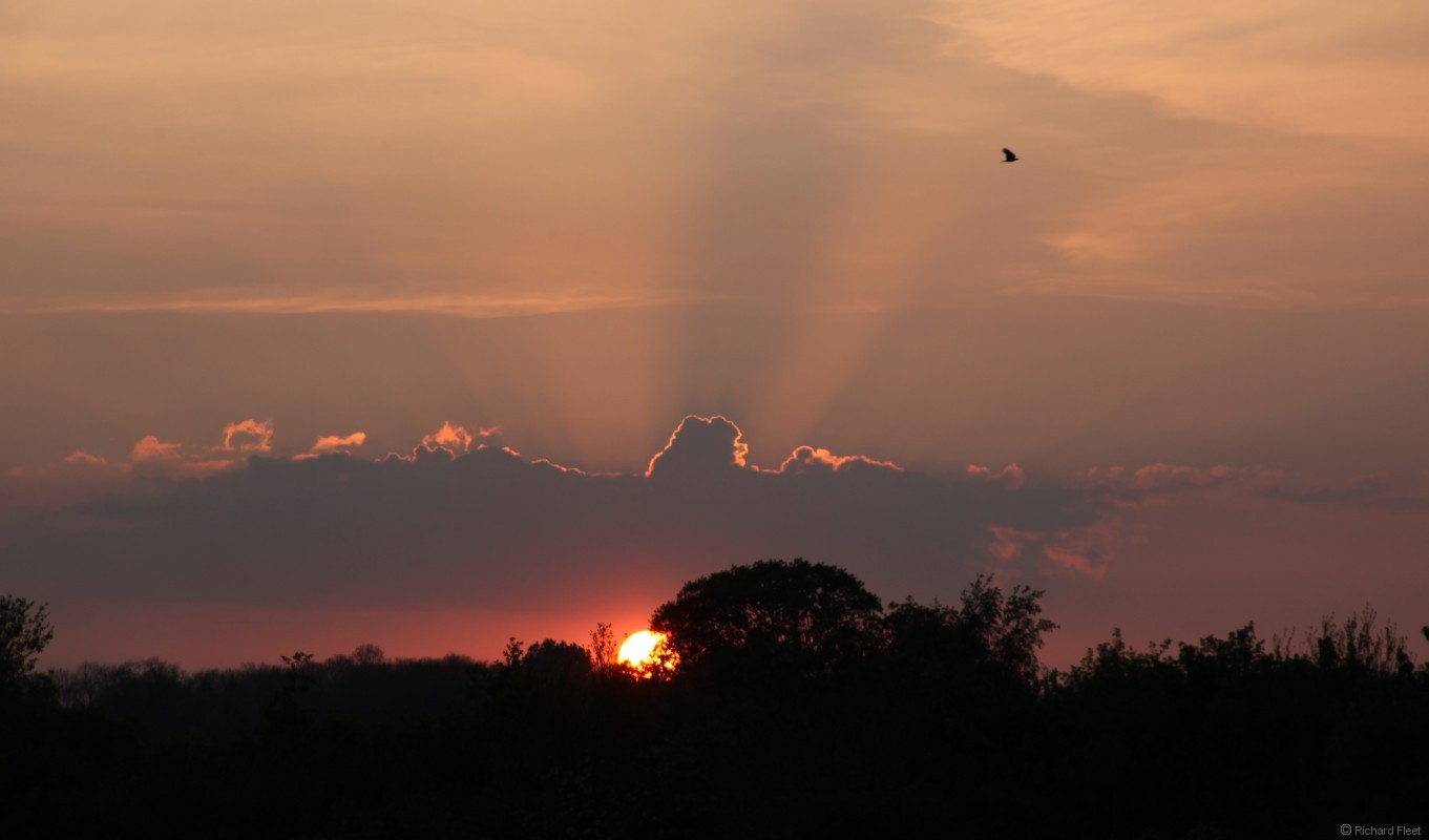 A small patch of cloud casts shadows which seem to radiate from the setting sun.