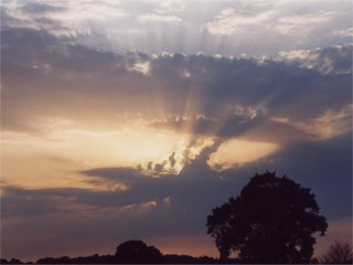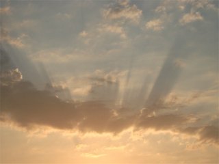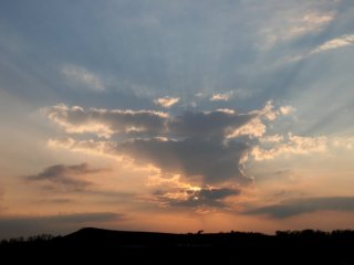 Delicate shadows radiate from the ragged edges of the upper cloud while the sun shines weakly through the lower cloud.