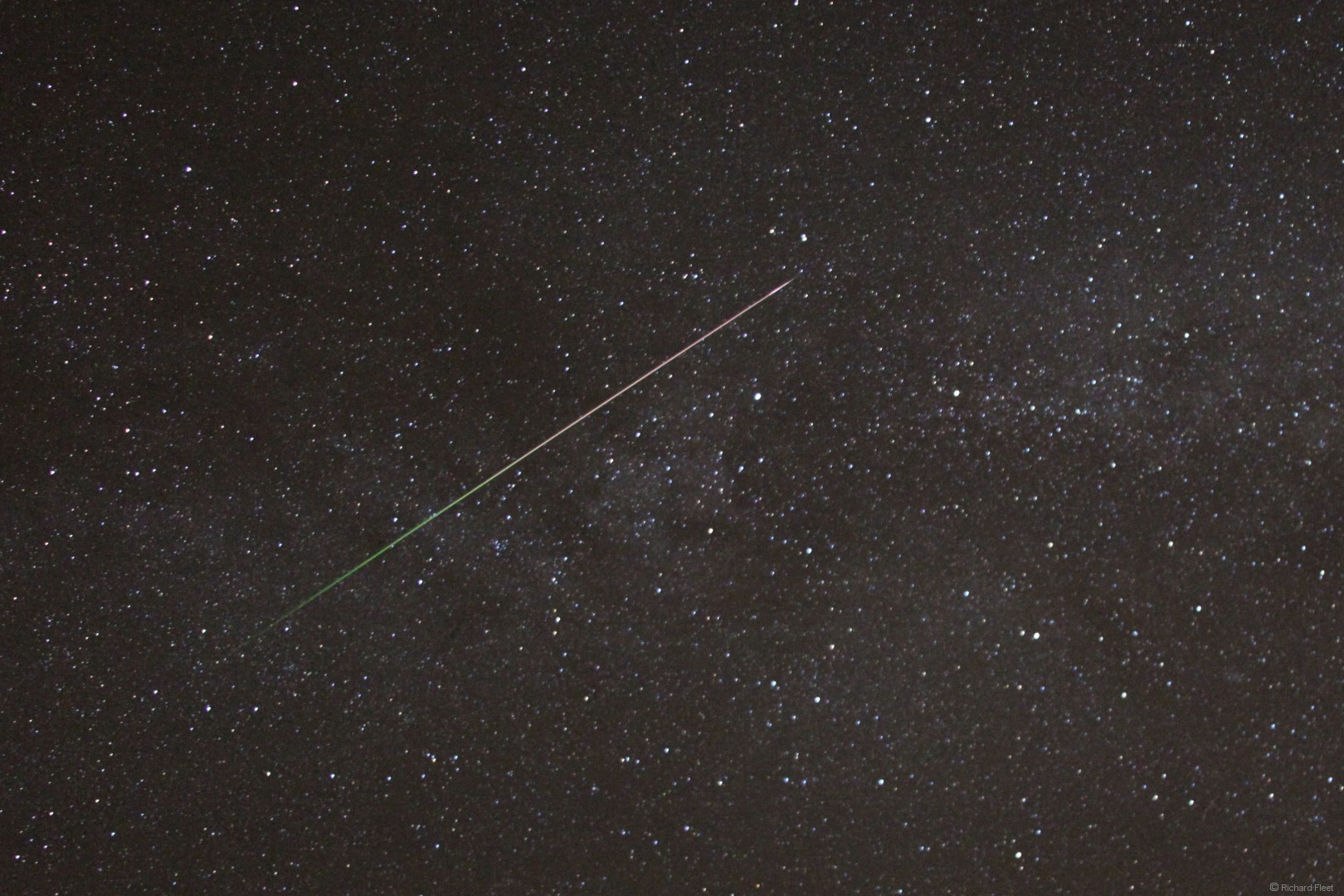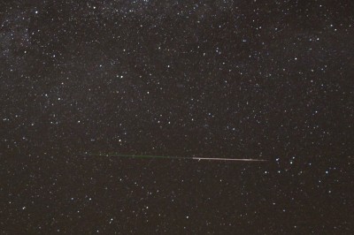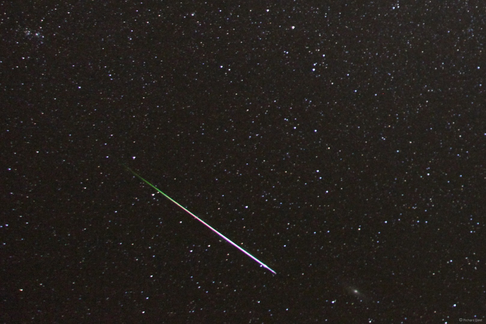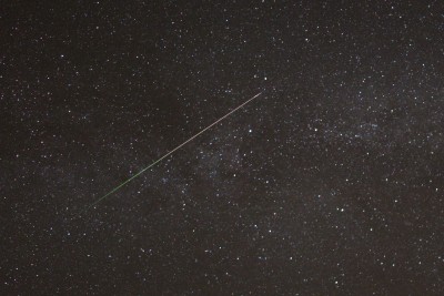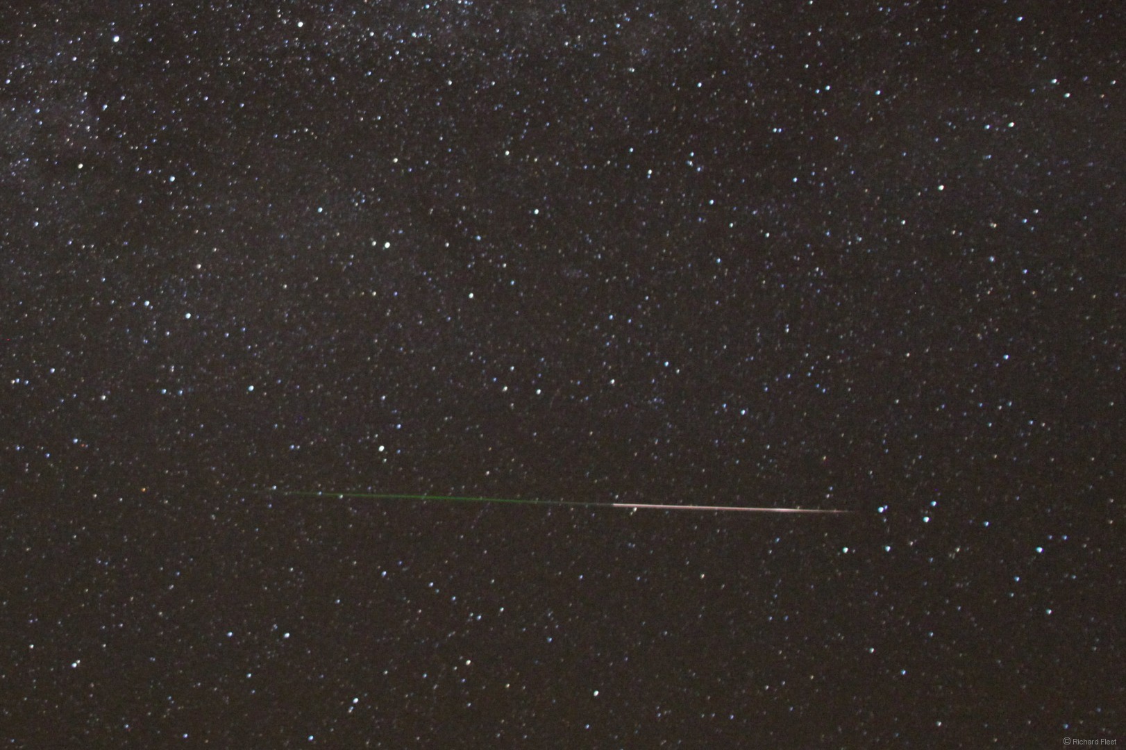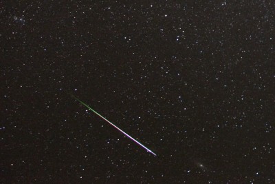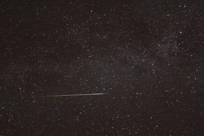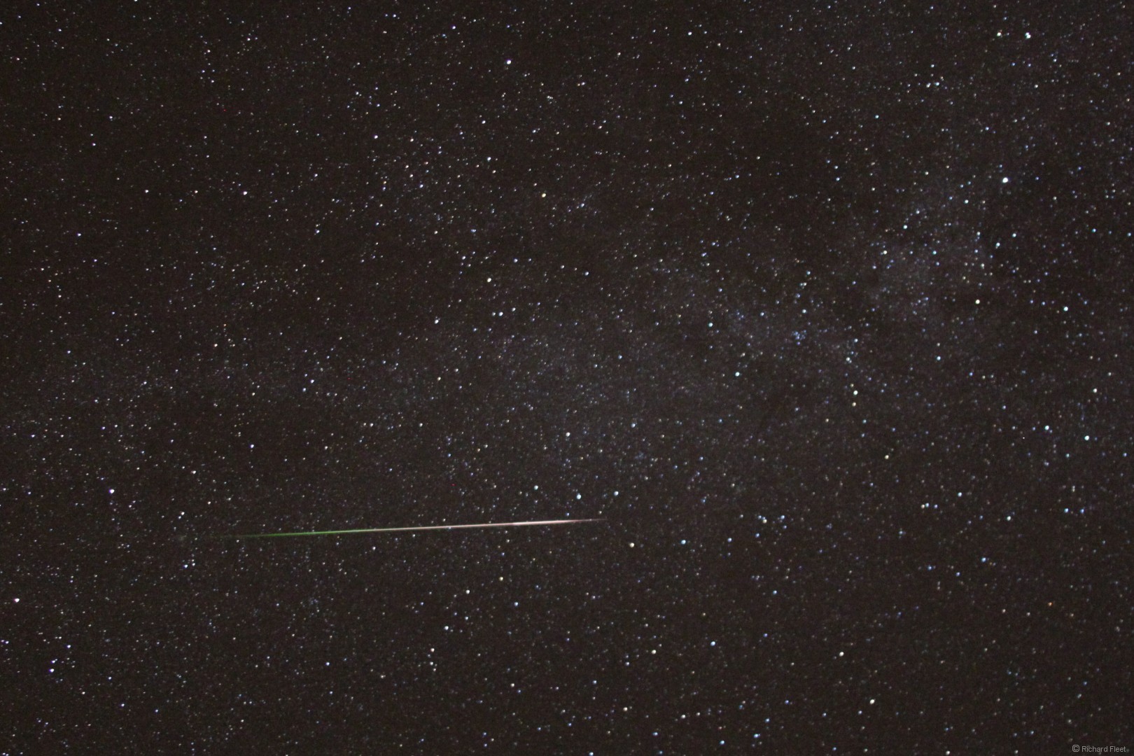 Harpooning Delphinus. The shutter only opened half way through the flight of this meteor - the green part on the left is the rapidly fading ionisation train.