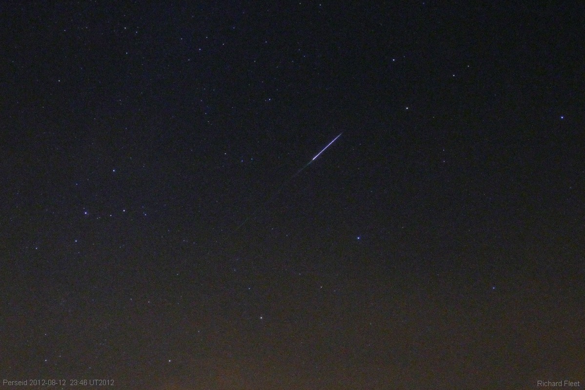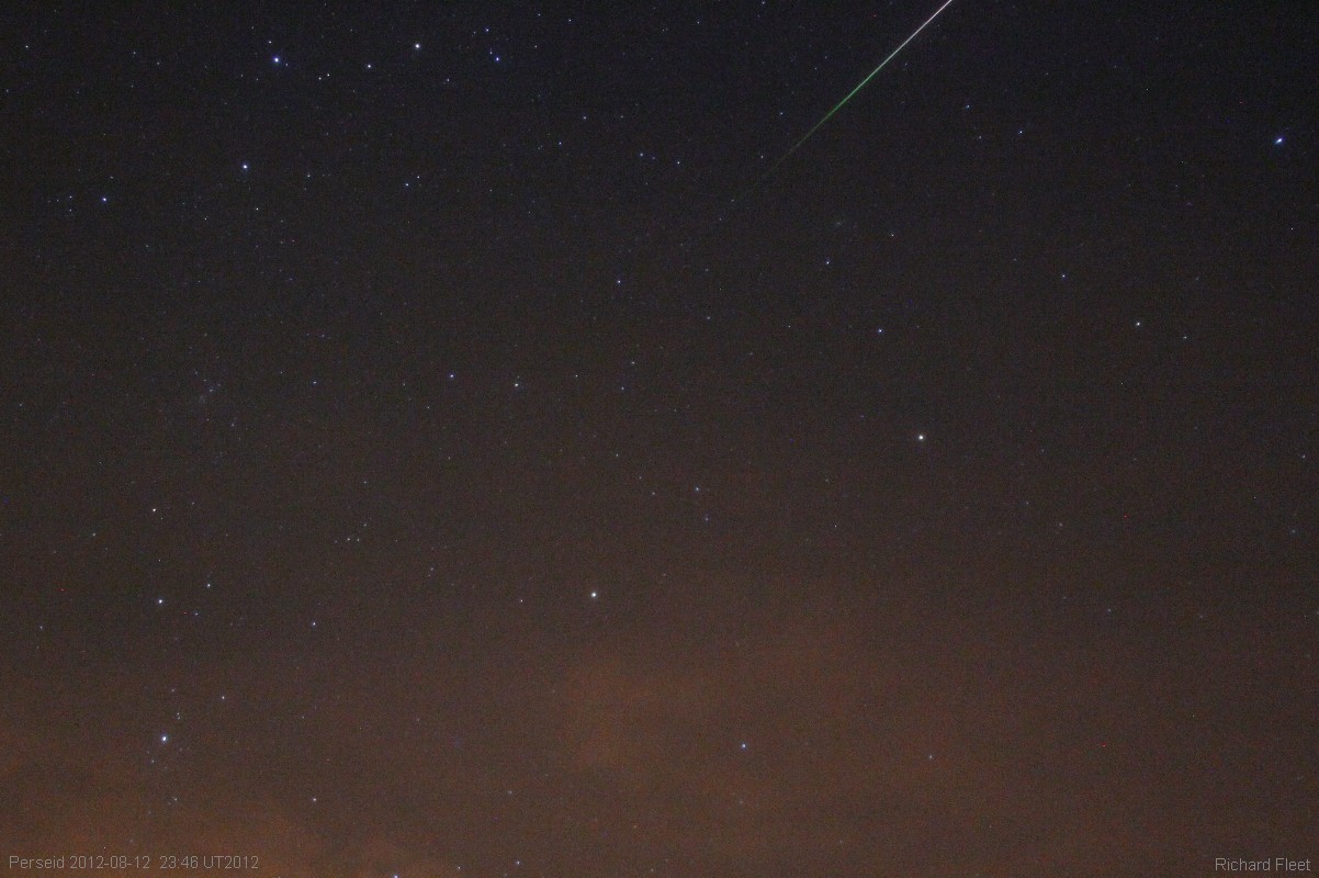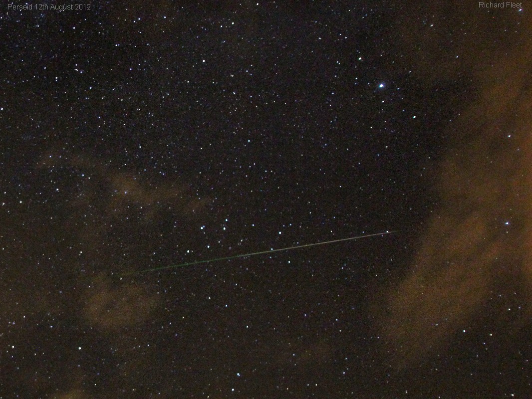 Conditions deteriorated later on but I left the camera running anyway. Luckily it captured the start of this bright Perseid, which would probably have rivalled Jupiter in brightness. |