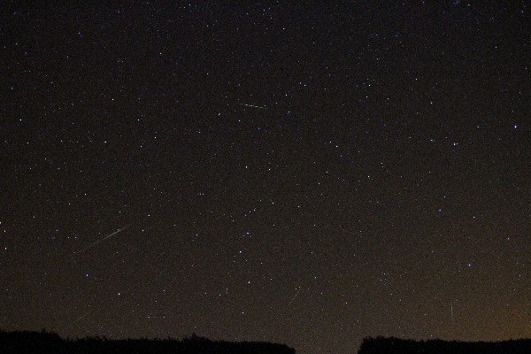 The brighter meteors show the distinctive greenish emission from the high atmosphere.