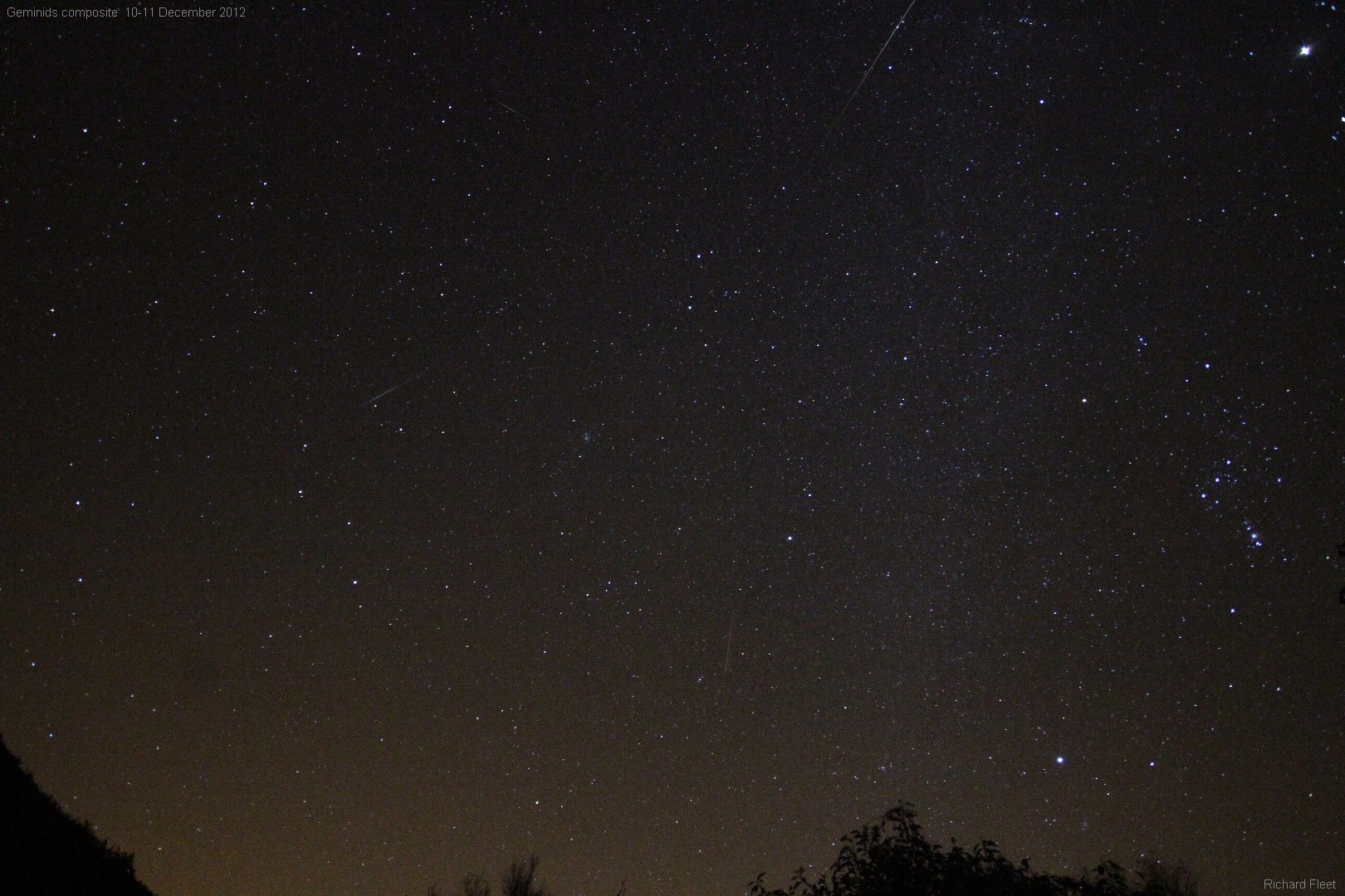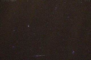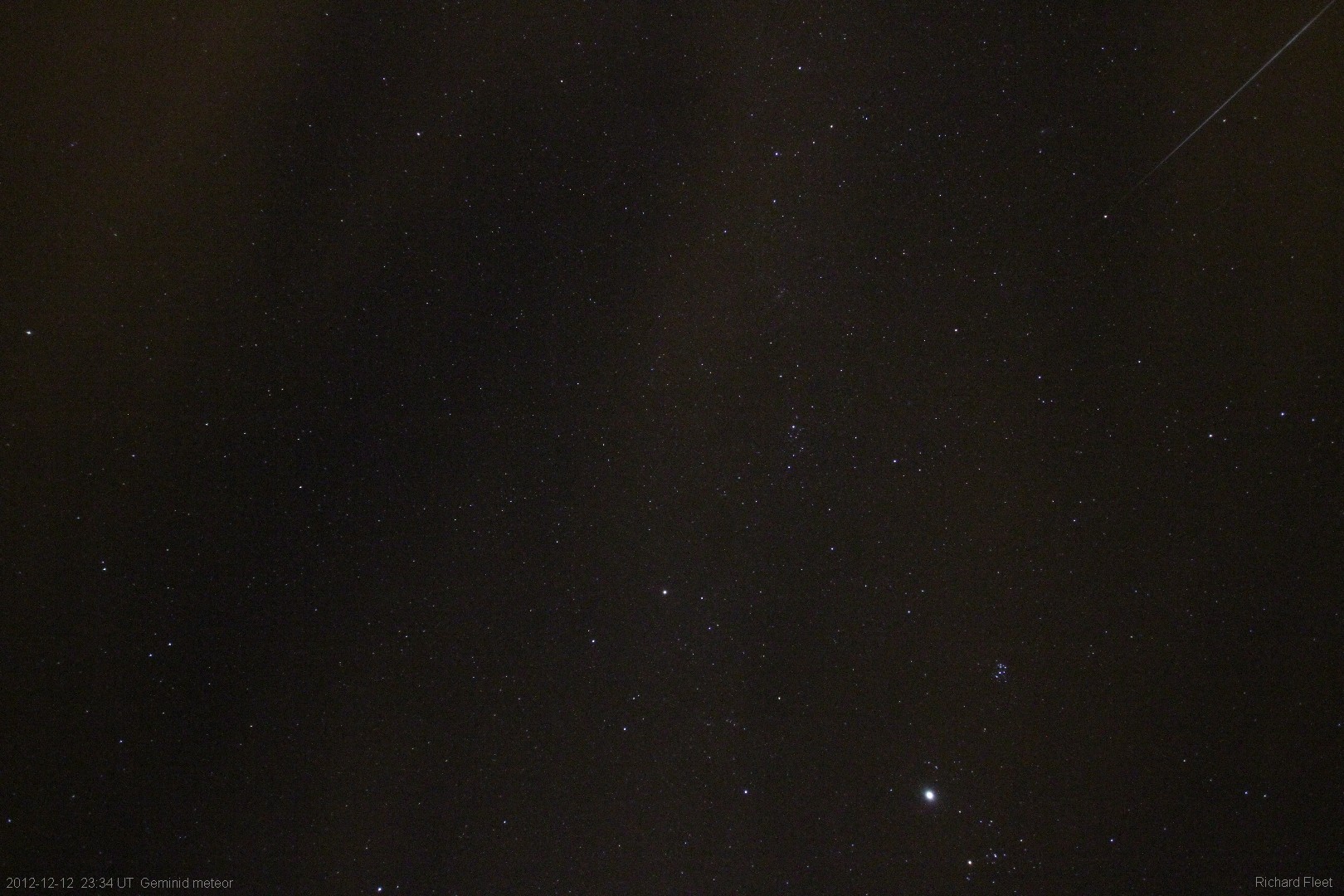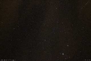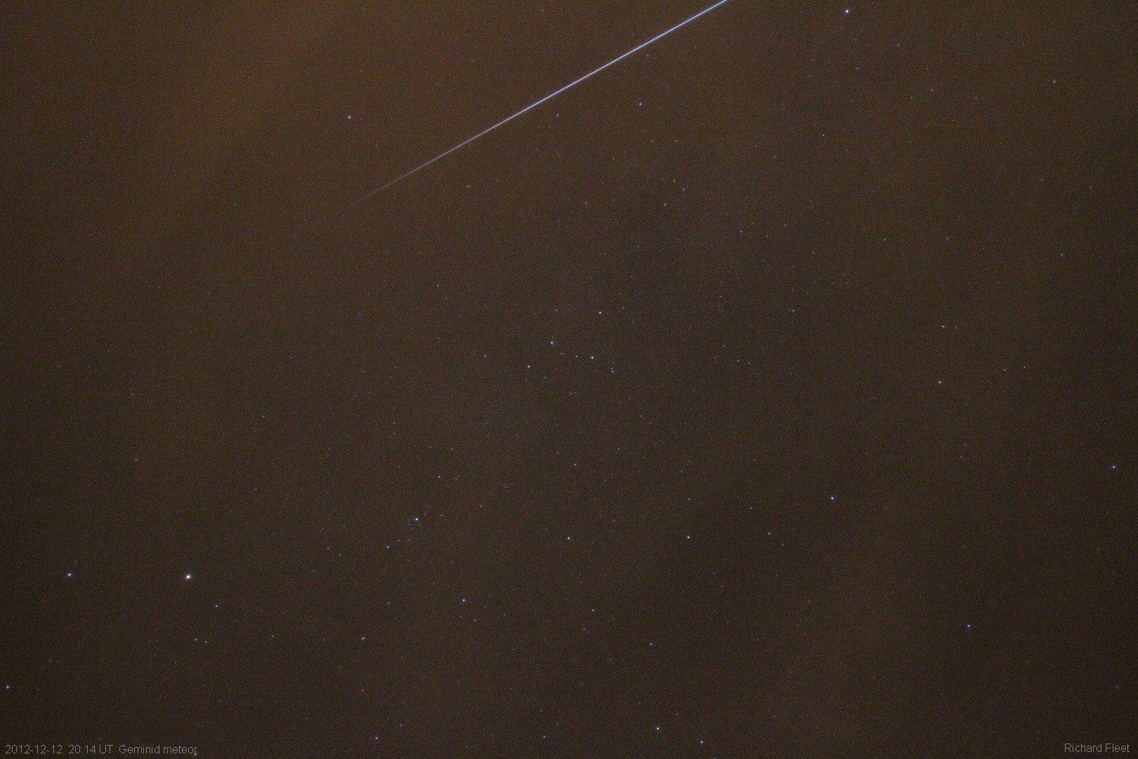 Conditions were poor on 12/13th December, the night before maximum, but I set up the camera anyway. Even through thin cloud this Geminid would have been spectacular. |