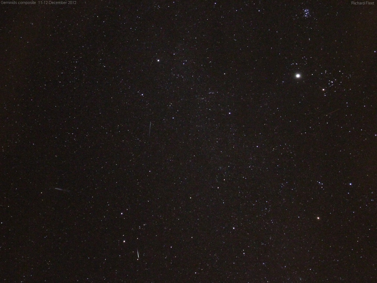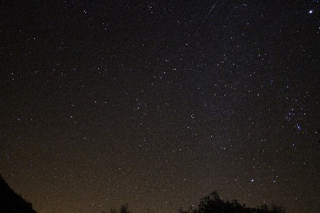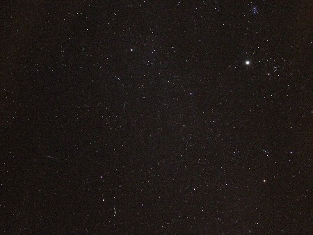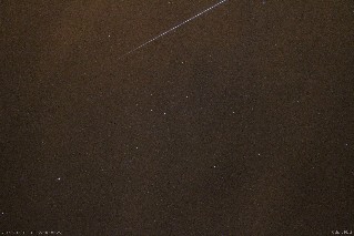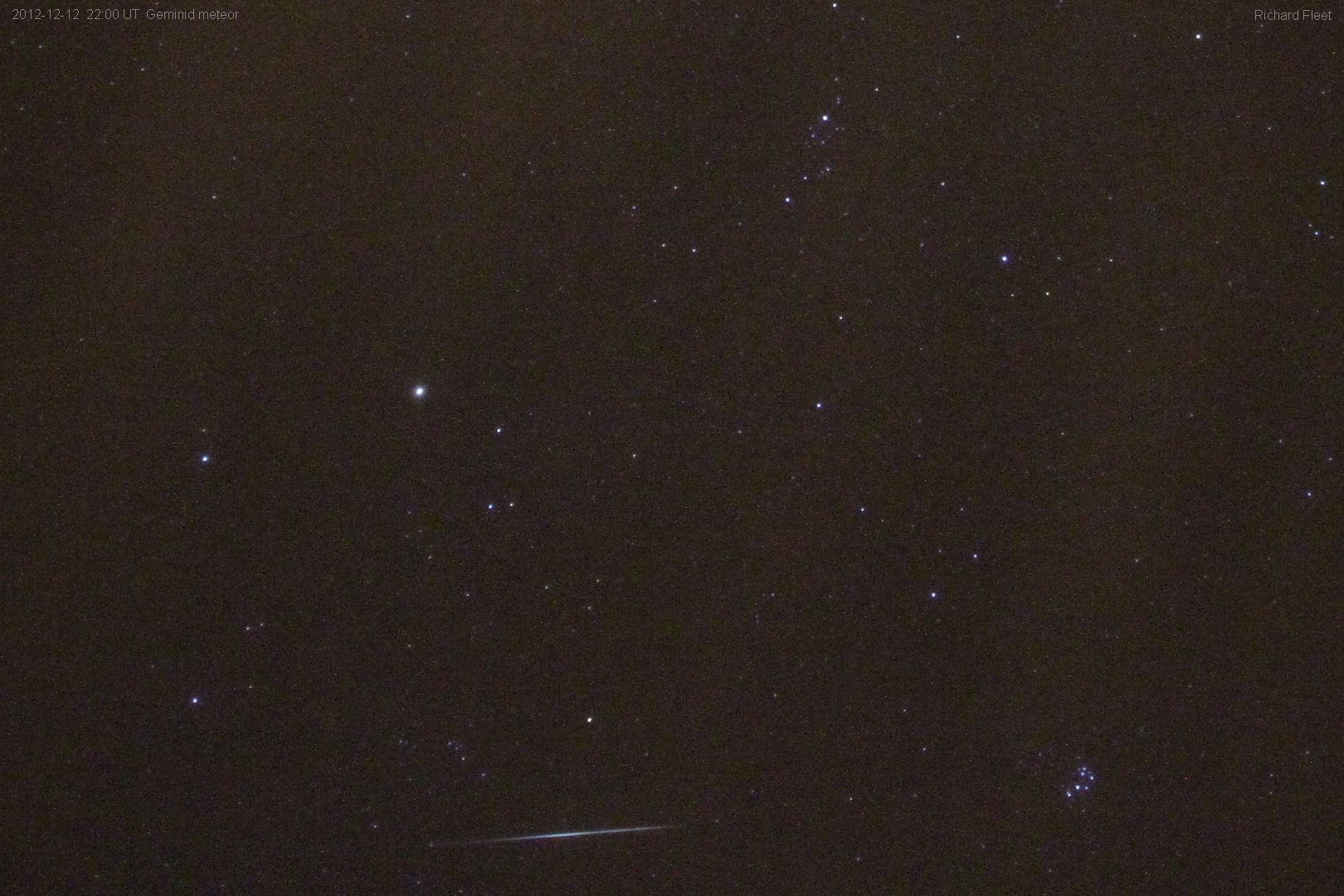 Conditions were poor on 12/13th December, the night before maximum, but I set up the camera anyway. Even through thin cloud this Geminid would have been spectacular. |