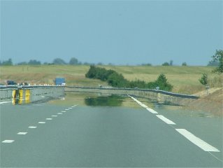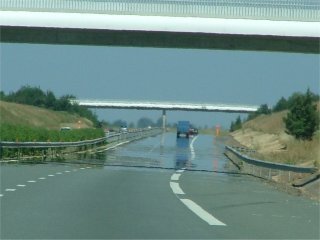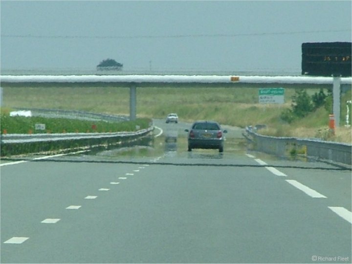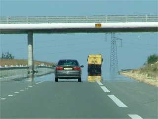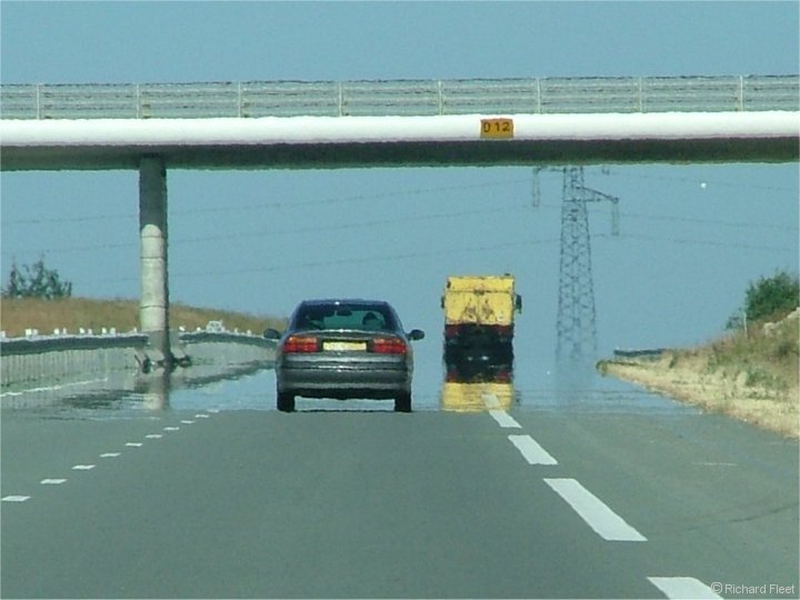 In this simple inverted mirage the line of trees and hillside are reflected in what looks like a large pool of water on the road. The bright white road markings still show through quite clearly.