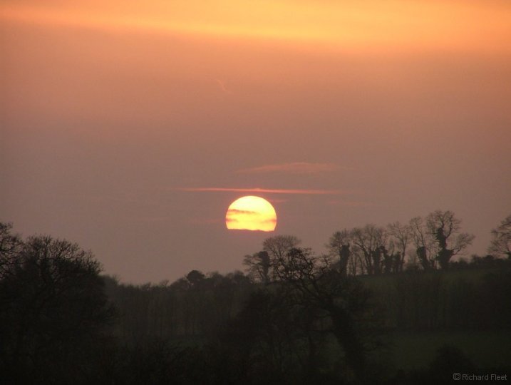 A watery winter sunset as the sun disappears behind a bank of low cloud.