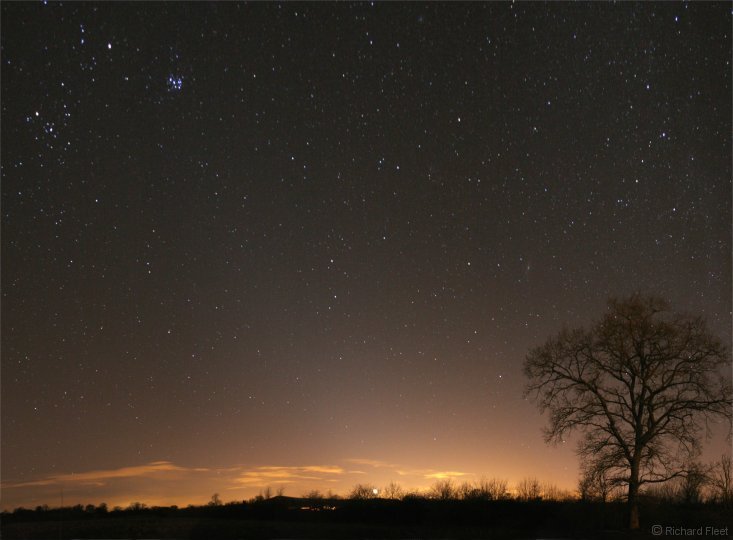 Moving up to the right is the distinctive constellation of Orion and further up to the right are the Hyades and Pleiades star clusters.