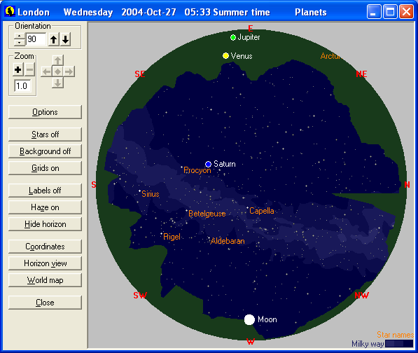 This provides an all sky view with options to show stars, Milky Way, grids, horizon etc. for the selected date and time.