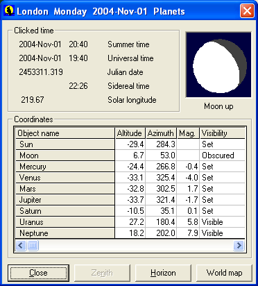 Where they can be calculated magnitudes are given and an indication of visibility, taking into account any specified horizon. The date and time is shown in various formats with an indication of the phase of the moon, if it is above the horizon. |