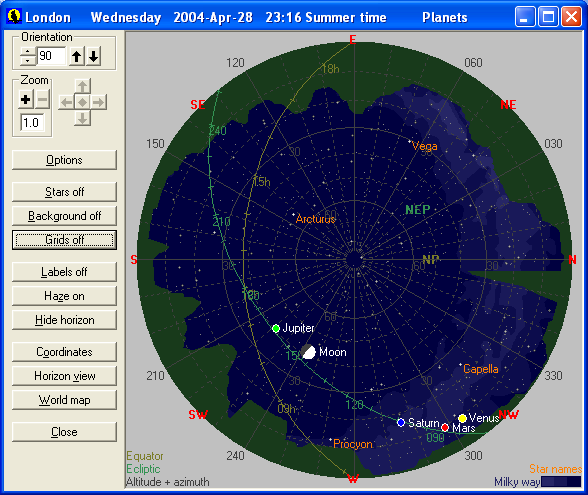 Grids for equatorial, ecliptic, galactic and horizontal coordinates can be shown.