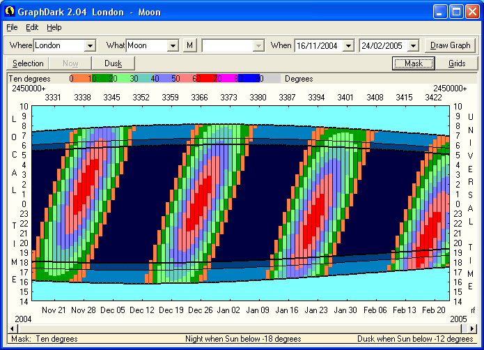 The coloured altitude mask has been turned on the show the moon's changing altitude during the night.