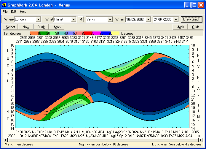 This example shows how Venus changes from being a prominent evening object in early 2004 to a morning object in late 2004.