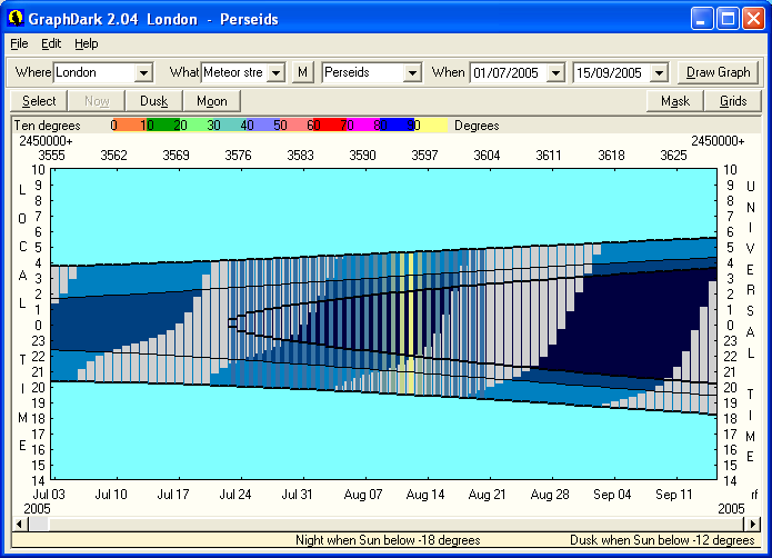 The period of visibility of a meteor stream can be displayed on the timetable, showing when the radiant is above the horizon and when moonlight will interfere.