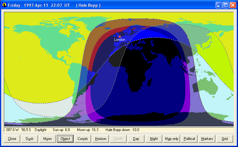 Moon and object visibility can be combined with night and day to show where an object is visible in a dark sky, assuming no clouds or light pollution of course!
