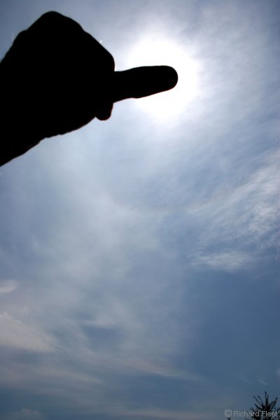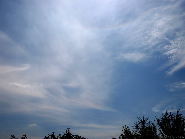 In this image part of a bright 22 degree halo is seen curving up near the top. At lower centre a trace of colour in the cloud betrays the presence of the arc.