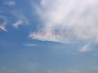About twice as far below the sun as the 22 degree halo is a slightly coloured wisp of cirrus.