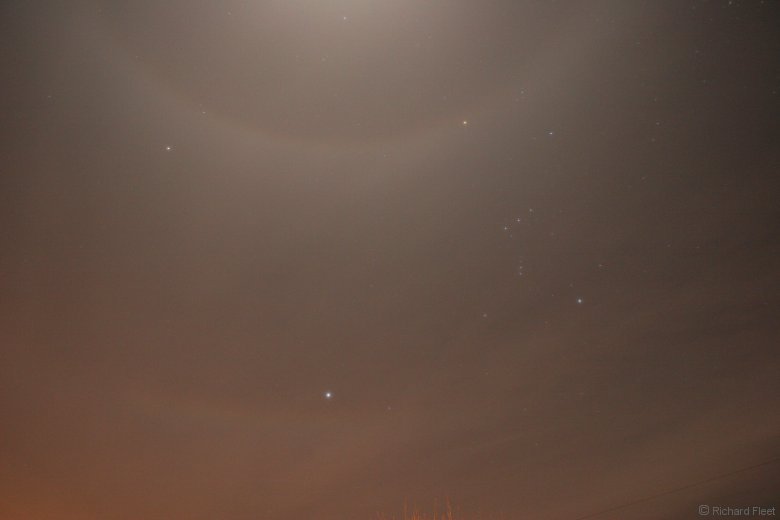 Unfortunately the cirrus is very good at reflecting distant light pollution so the background is a dirty brownish tint, making it harder to pick out the halo colours.