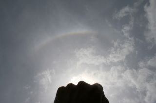 This halo started with fairly strong upper and lower tangent arcs joined up by a weaker 22 degree halo. The right edge is a bit obscured by the vertical streak of cirrus. |