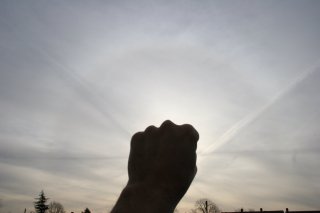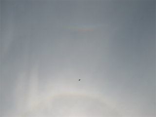 The sky was filled with cirrus all morning but only some of it produced halo effects, like this rather washed out 22 degree halo. Contrails and their shadows helped to make it a bit more interesting.