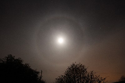 Because of the poor sky only a few stars are visible in this still from the sequence. Castor and Pollux are just above the Moon while Capella is the bright star outside the halo on the right. |