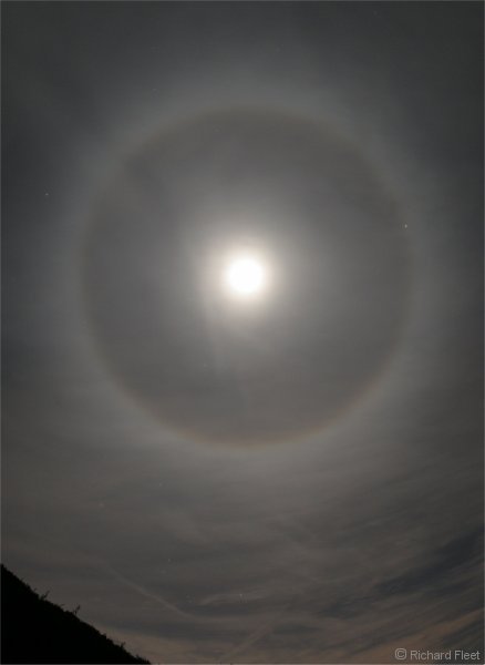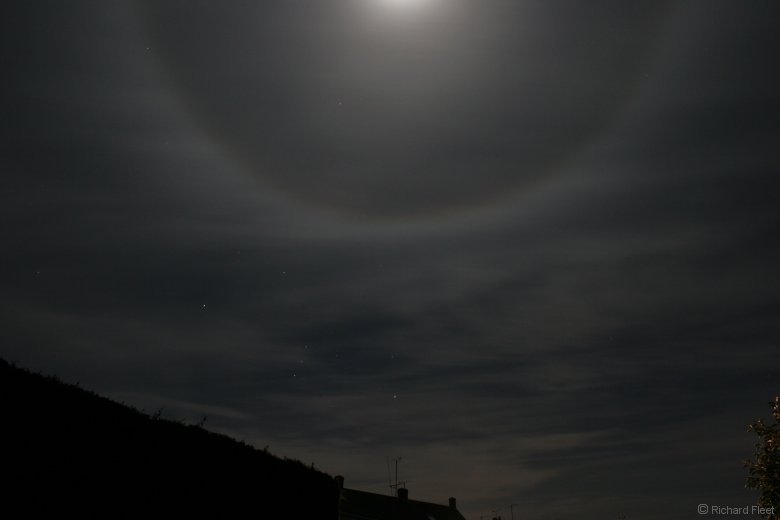 In this view of the lower section of the halo Orion can be seen rising over the hedge and houses at lower left. |